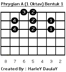 Prhygian scale Seperti halnya dengan scala yang lain,dalam prhygian scale juga saya hanya membahasnya dalam bentuk akord A saja. Beberapa hal yang paling penting diketahui dalam Phrygian A scale : - A = Mi (3) atau F = Do (1) - Akord yang di pakai : Am dan Am7. - Jarak nada : 1/2 - 1 - 1 - 1 - 1/2 - 1 - 1. - Urutan nada : A - Bb - C - D - E - F - G - A ( 3 - 4 - 5 - 6 - 7 - 1 - 2 - 3 ) - Cara memainkanya boleh dari senar/nada tertinggi ke senar/nada terendah atau sebaliknya. Lebih jelasnya perhatikan tab berikut : 1.Tab scale prhygian A dalam 1 oktav bentuk 1 Start pada jari tengah senar 6 fret ke 5 atau jari kelingking pada senar 4 fret ke 7.